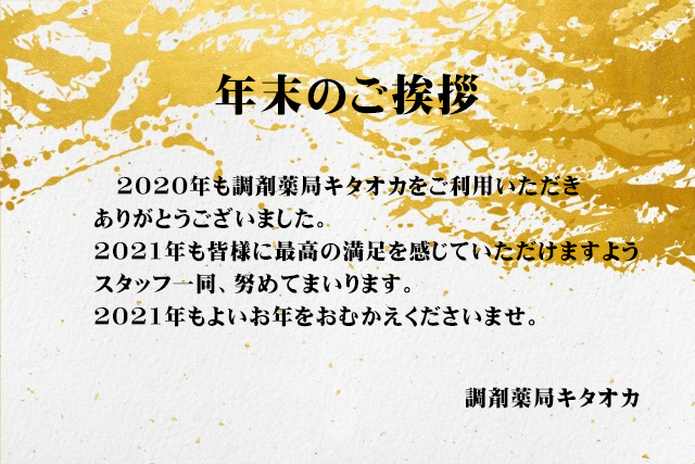 年末のご挨拶 年末のご挨拶 2020年も調剤薬局キタオカをご利用いただき ありがとうございました。 2021年も皆様に最高の満足を感じていただけますよう スタッフ一同、努めてまいります。 2021年もよいお年をおむかえくださいませ。 調剤薬局キタオカ